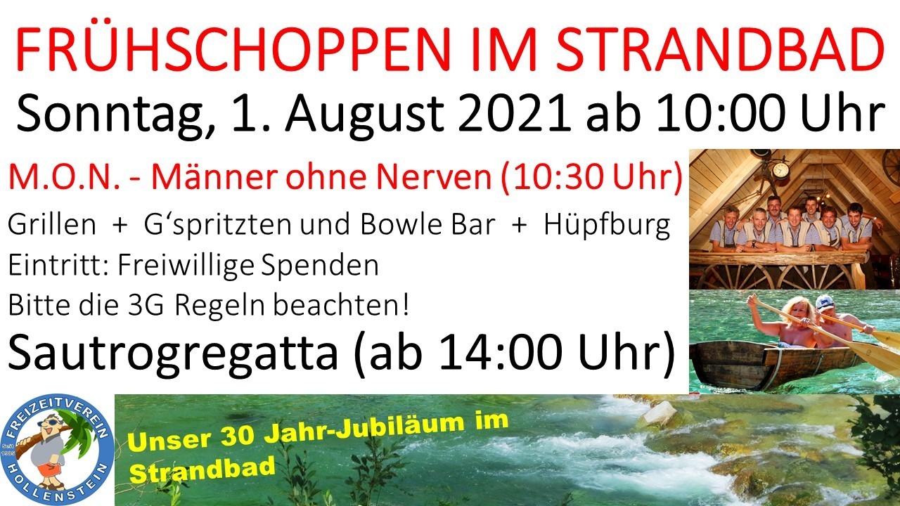 Frühschoppen - Grillen - G`spritzen und Bowle Bar - Sautrogregatta - Hüpfburg - Live Musik30 Jahr Jubiläum Freizeitverein im Strandbad