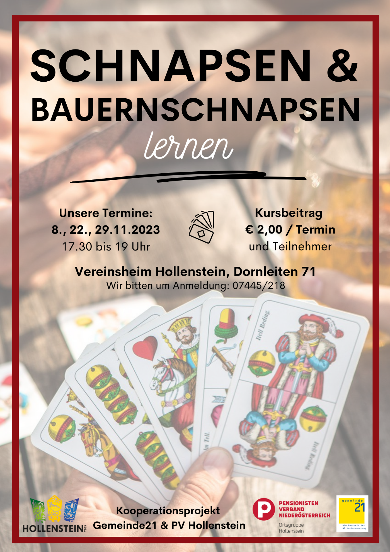 Vzbgm. Walter Holzknecht und Freiwillige des Pensionistenverein Hollenstein bringen uns das traditionelle Kartenspiel bei. Es sind dafür KEINE Grundkenntnisse erforderlich.