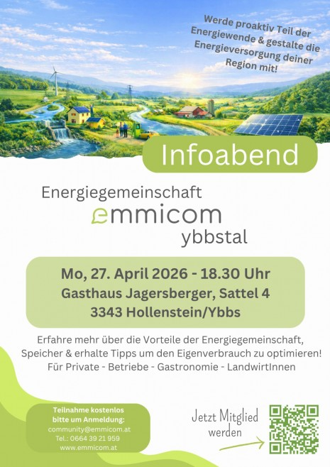 Erfahre mehr über die Vorteile der regionalen Energiegemeinschaft in Hollenstein! Zusätzlich zum spannenden Speicher‑Beitrag gibt es praxisnahe Tipps, wie ihr euren Eigenverbrauch optimal steigern könnt. Bitte um Anmeldung an: community@emmicom.atemmicom ybbstal